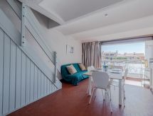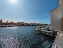 Residence Les Brigantins. On the outskirts, 3 km from the sea, 50 m from the lake, 3 km from the beach, in a cul-de-sac. For shared use: natural pond, public parking 80 m. Grocery 3 km, supermarket 5 km, shopping centre 4 km, restaurant 2 km, bar 2 km, bakery 3 km, bus stop Le Barcarès 600 m, railway station La Franqui 16 km, sandy beach 3 km, diving center 6 km, outdoor swimming pool 4 km, nudist beach 5 km. Sports harbour 7 km, surf school 1 km, sailing school 3 km, tennis 3 km, minigolf 5 km, riding stable 9 km. Nearby attractions: Aqualand Port Leucate 7 km, Réserve Africaine de Sigean 41 km, Fort de Salses 20 km, Narbonne 55 km, Perpignan 25 km, Barcelone 215 km. Well-known lakes can easily be reached: Etang de Leucate ou Salses 7 km, Lac de Villeneuve de La Raho 28 km. Hiking paths: Sentier du guetteur 8 km, Station meteorologique de Opoul Perillos 25 km, Sentier du littoral Collioure 40 km. Please note: car recommended. Residence with electric gates. The photograph shows a typical example. Additional accommodations can be booked. Protection barrier on the pontoon.